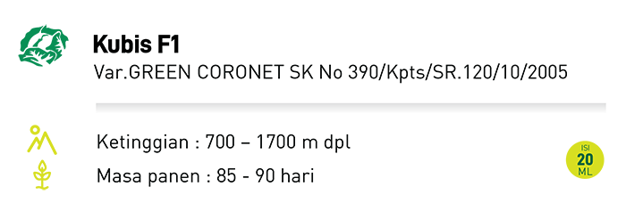 GREEN CORONET adalah Benih Kubis yang cocok untuk dataran tinggi. Umur panen 85-90 hari setelah tanam. Hasil berbentuk bulat gepeng, sangat padat, kuat angkutan, dan sangat produktif. Tahan disimpan di ruangan terbuka.