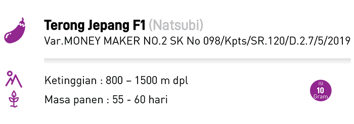MONEY MAKER NO 2 adalah Benih Terong. Berat per buah 100 gr. Dapat ditanam pada dataran tinggi dan rendah.