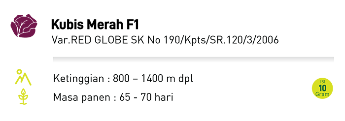 RED GLOBE merupakan benih kubis merah yang sangat cocok untuk dataran tinggi dan sangat mudah pemeliharaannya. Kubis ini sangat padat sehingga tahan terhadap transportasi jarak jauh dan warna daun merah keunguan. Berat rata-rata RED GLOBE (kubis merah) 1.5 – 2 kg per tanaman.