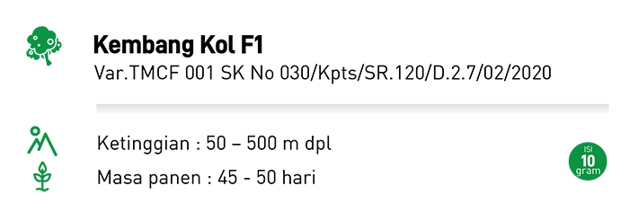 TM KIRAN adalah Bunga Kol Hibrida untuk dataran rendah.Potensi hasil 19 – 25 ton/ha. Bentuk kubah. Kemampuan adaptasi sangat baik untuk berbagai macam kondisi. Tanaman vigor, toleran panas cocok untuk tanah berpasir dan sawah, Tahan Serangan Busuk Hitam, Embun Bulu dan Busuk Lunak.
