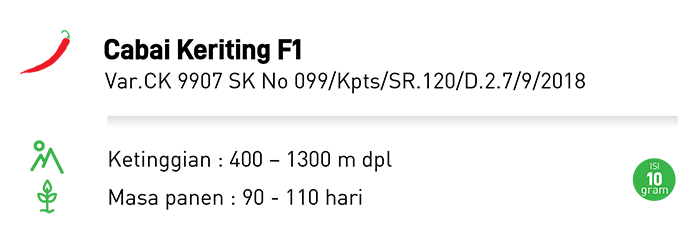 TM THUNDER 99 Merupakan Benih Cabai Keriting Hibrida untuk dataran rendah sampai tinggi. Diameter buah 0.6 – 0,8 cm, Panjang buah 17 – 19 cm dengan berat 6 – 7 gr per buah. Buah Padat dan Keras sehingga tahan simpan dan tahan transportasi jarak jauh. Tanaman Toleran teradap penyakit Antraknosa dan Layu.