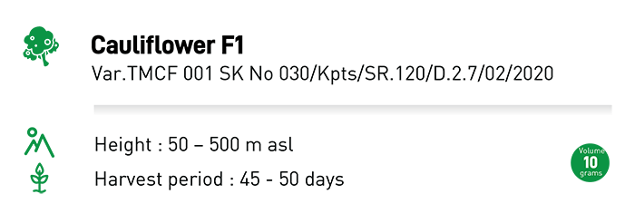 TM KIRAN is a hybrid cauliflower for the lowlands. The yield potential is 19 – 25 tonnes/ha. Dome shape. Excellent adaptability to various conditions. Vigorous plant, heat tolerant suitable for sandy soil and paddy fields, Resistant to Black Rot, Feather Dew and Soft Rot.