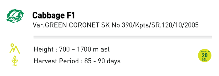 GREEN CORONET is a Cabbage Seed suitable for the highlands. Age of harvest 85-90 days after planting. The results are flattened round shape, very dense, strong transport, and very productive. Hold stored in open space.