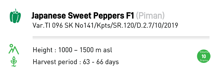 TI 096 is a Hybrid Parika Seed. Plants have resistance to TMV, TOMV, and PMMoV-L3. The average weight of the fruit is 30 grams per fruit. The color of the fruit is dark green. The fruit develops well even at low temperatures.