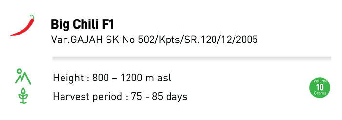 TM GOCHU is a large type of chili which can be planted in medium to high altitudes. Fruit diameter is 1.4 – 1.6 cm, fruit length is 14 – 17 cm. Young fruit color is green and dark fruit color is red. Tolerant to anthracnose and Withered, Solid Fruit so Resistant to Transportation and Storage Resistant.