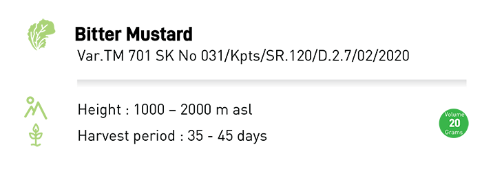 TM VALOR Is a Seed of Bitter Mustard Greens with thick leaves with thick stems and broad, dark green leaves. Young stems can bend inward and form a head. Mustard is suitable for planting in the middle to upper plains.
